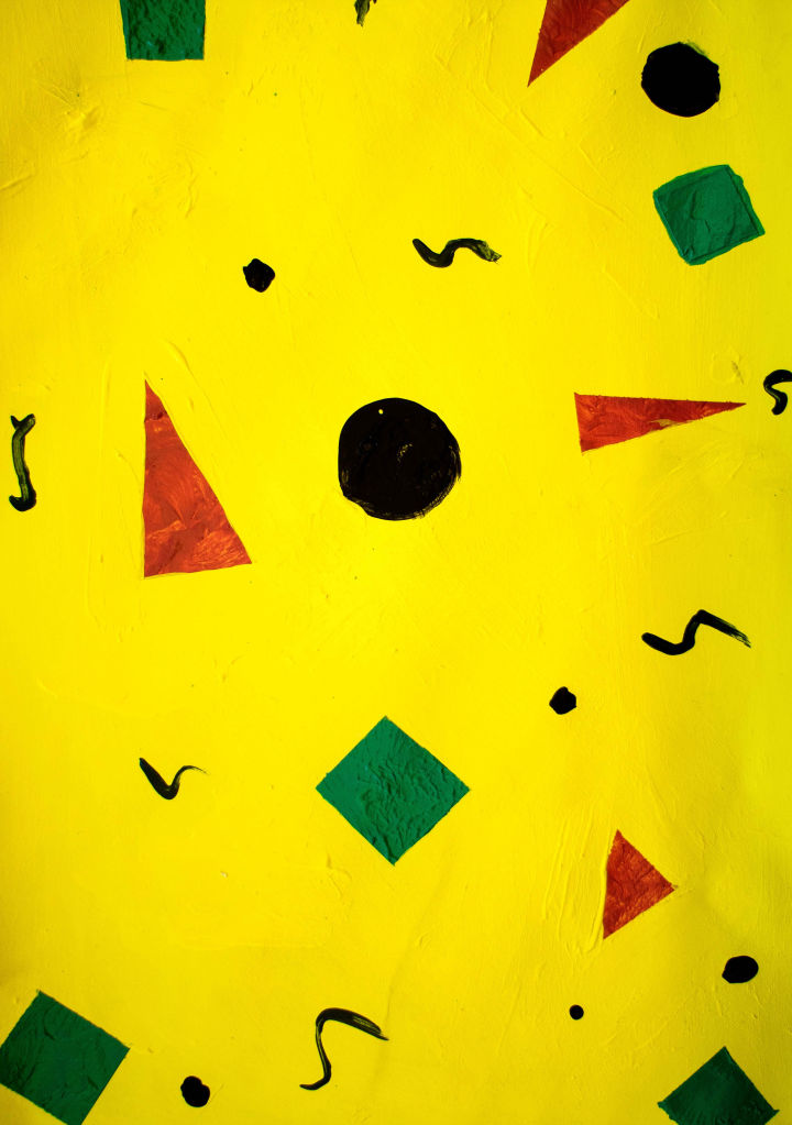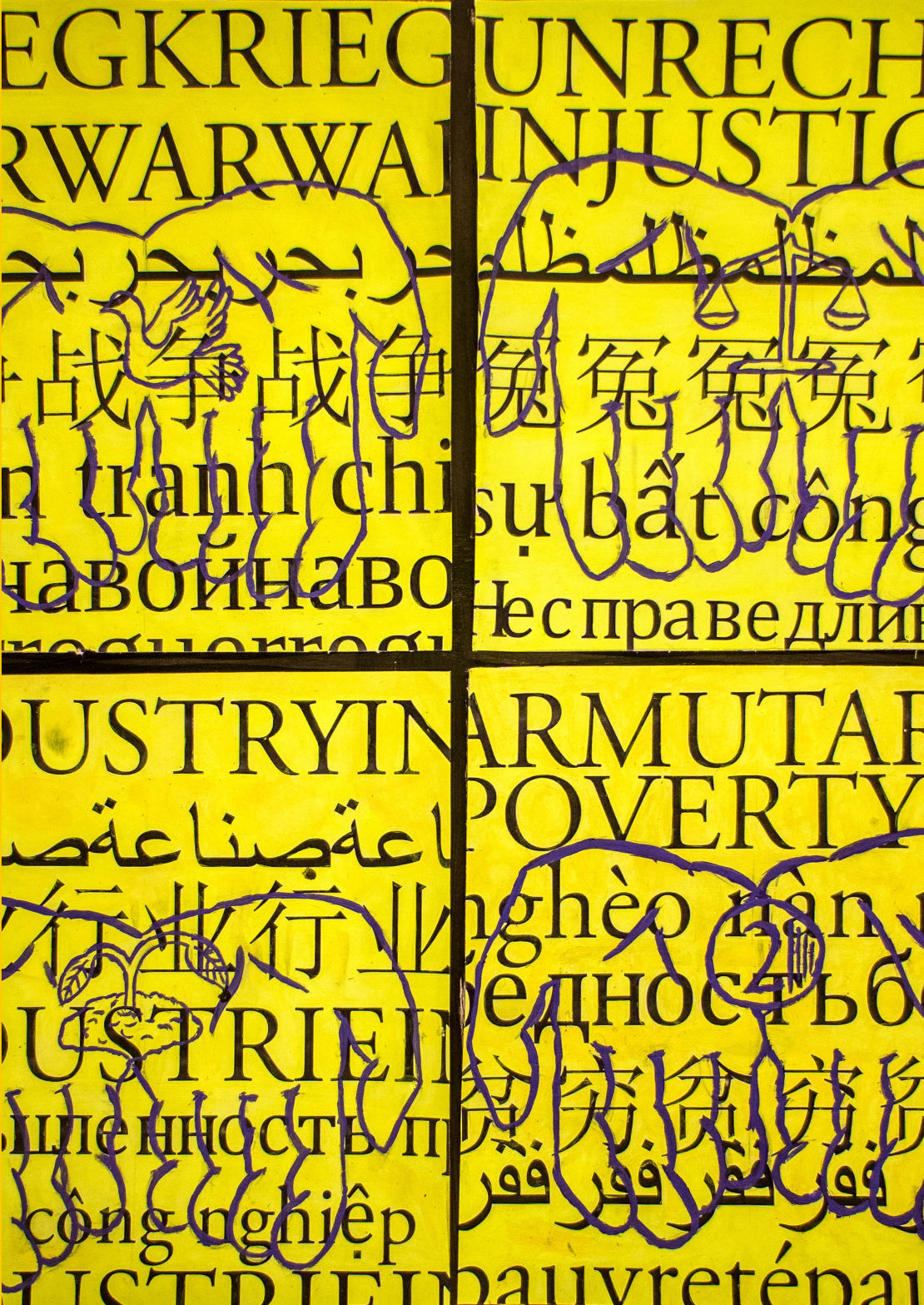 Meine Farbe Gelb steht eigentlich für gute Laune. Diese Farbe wird durch die schwarze Schrift zerstört, die gute Laune wird durch die Worte „Krieg“, „Industrie,“ „Unrecht“ und „Armut“ zerstört. Über den schlechten Worten und der zerstörten Farbe sind die Umrisse von Händen in der gegenteiligen Farbe (Lila) mit jeweils dem symbolischen Gegenteil der Worte aufgemalt.