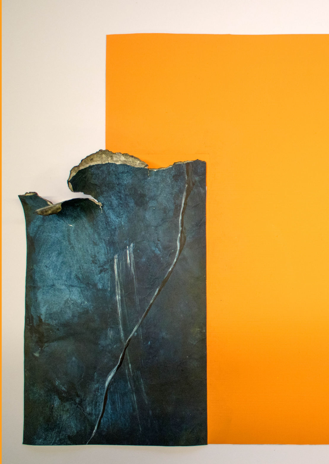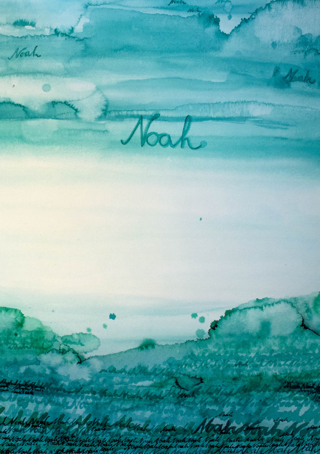 Eine Woche lang suche ich nach einem passenden Wort, welches meiner Farbe entspricht. Es soll kein beliebiges Wort sein, das Wasser unmittelbar verlautet wie „Ozean“, oder „Meer“. Ich möchte ein Wort nutzen, das nicht nur die Farbe widerspiegelt, sondern auch eine Geschichte erzählt, die Hoffnung und Trost thematisiert und dem Betrachter Kraft spendet. Da schießt mir der Name Noah durch den Kopf. Noah, der seine Familie und die Tiere der Erde in der Arche vor der Flut rettet. Hier kommt das Schöpferische und Zerstörerische der Wasserkraft zum Vorschein. Durch meine Recherchen finde ich heraus, dass Noah aus dem Hebräischen stammt und mit „Ruhe“ und „Trost“ übersetzt werden kann. Das Wort trägt demnach genau die Bedeutung, die ich mit meiner Gestaltung erreichen möchte.