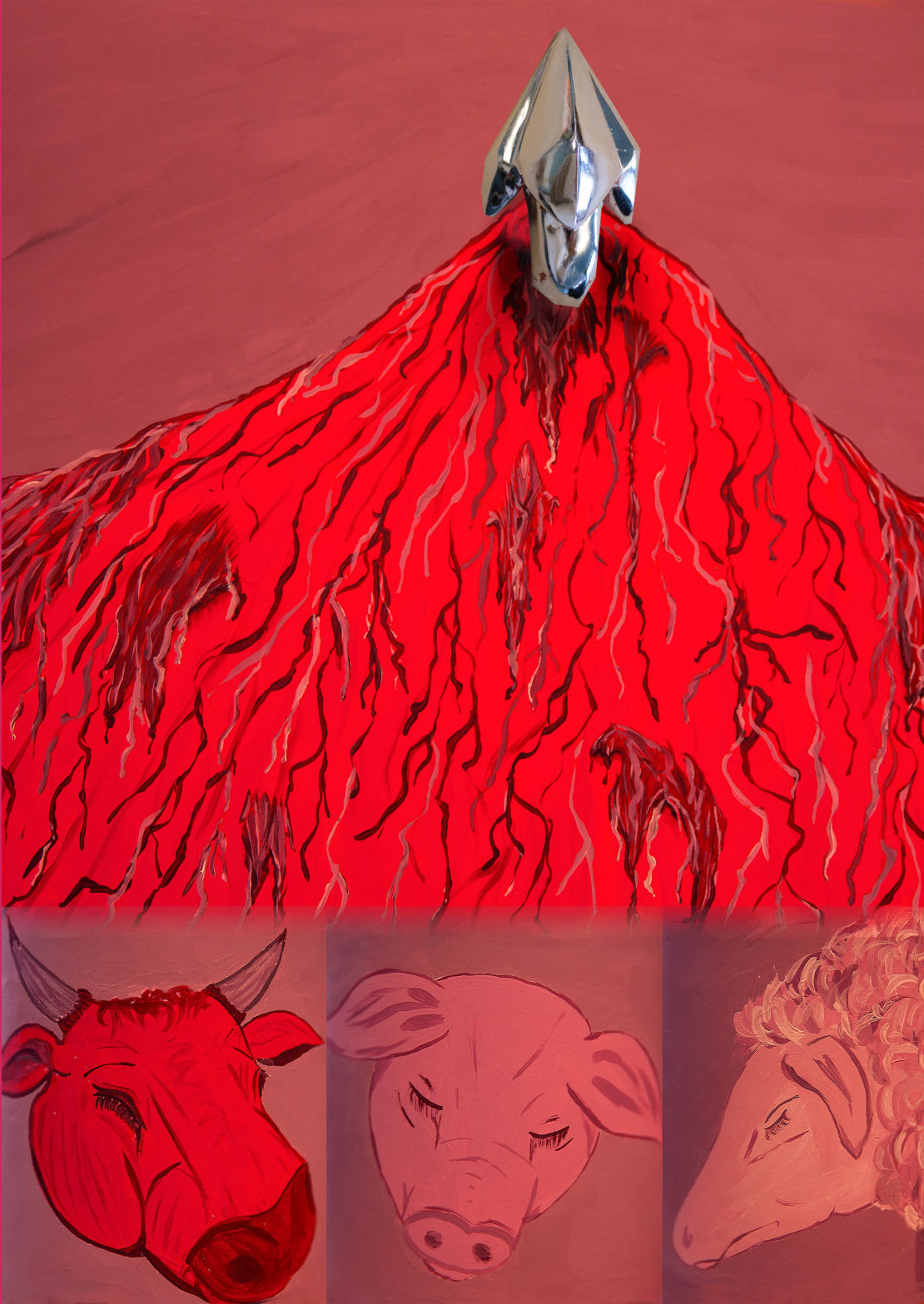 Ich habe die Farbe Rot gewählt, weil es für mich symbolisch die Massentierhaltung und die damit verbundenen Qualen gut zum Ausdruck bringt. Die Massentierhaltung ist ein grundlegendes Problem der Menschen in der westlichen Welt. Man möchte viel und billig Fleisch und Milchprodukte kaufen, viel mehr als man bräuchte.
