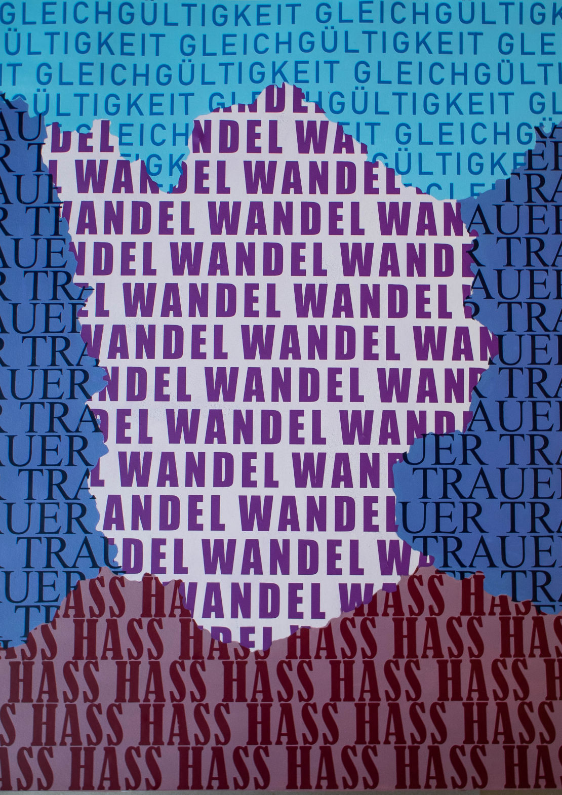 Eine Farbe hat die Bedeutung von vielen Worten, wenn diese jedoch Grenzen zwischen uns bilden sollten wir aufpassen, welches wir wählen. Das Faszinierende an der Farbe Violett ist für mich die Entstehung der Farbe, da sie aus zwei sehr gegensätzlichen Farben gemischt wird. Zum einen aus Rot, welches sehr aggressiv ist, und zum anderen aus Blau, welches sehr kalt wirkt. Anfangs hatte ich große Schwierigkeiten, eine so tiefgehende und komplexe Farbe wie Violett in einem einzigen Bild zu fassen, vor allem, da ich den harten Kontrast der Farbe selbst aufzeigen wollte. Deshalb entschied ich mich, die Farbe in Worten darzustellen. Durch meine Faszination für Landkarten entdeckte ich, dass sich der Gedanke einer Landkarte gut in mein Projekt einbauen ließe. Schauen wir uns heutzutage eine Landkarte an, sind für uns die Ländergrenzen etwas Selbstverständliches, aber warum?